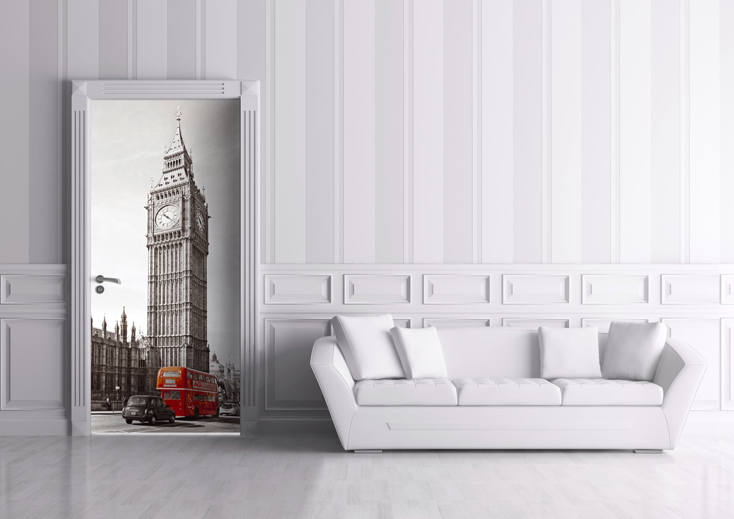 The Big Ben Parliament London Red Bus On Black And White Wall