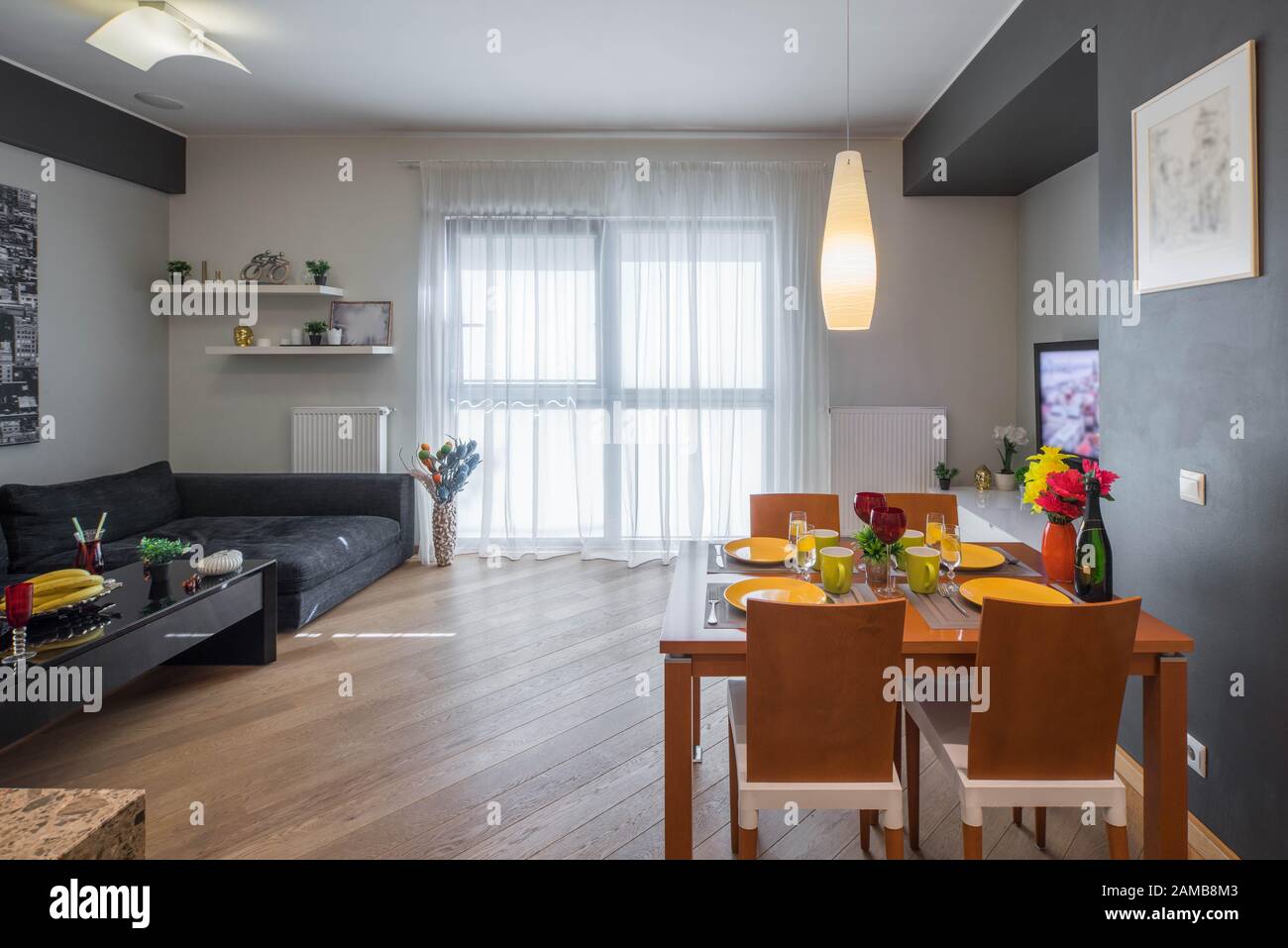 Modern Interior With Big Table Chairs And Living Room Stock Photo