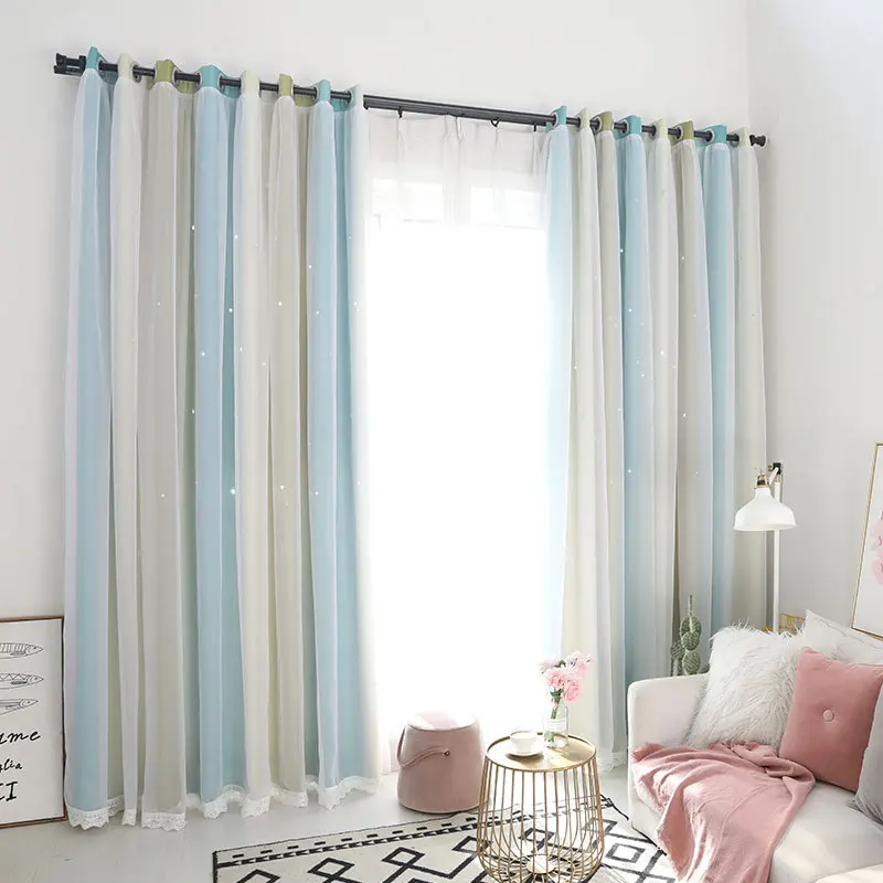 Blue Green Stars Blackout Curtains For Living Room Brown Stitching