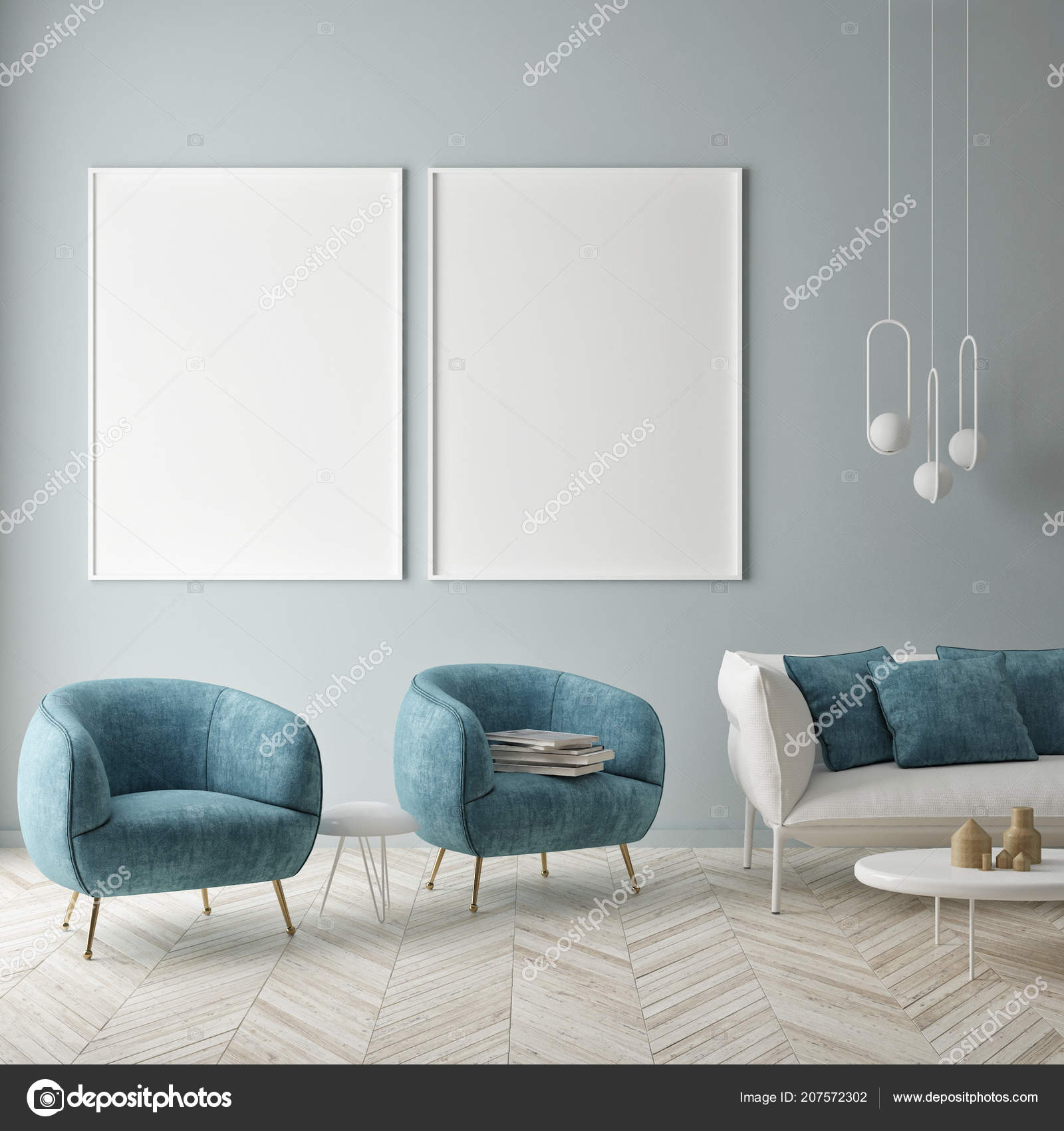 Mock Poster Blue Wall Blue Living Room Render Illustration Stock