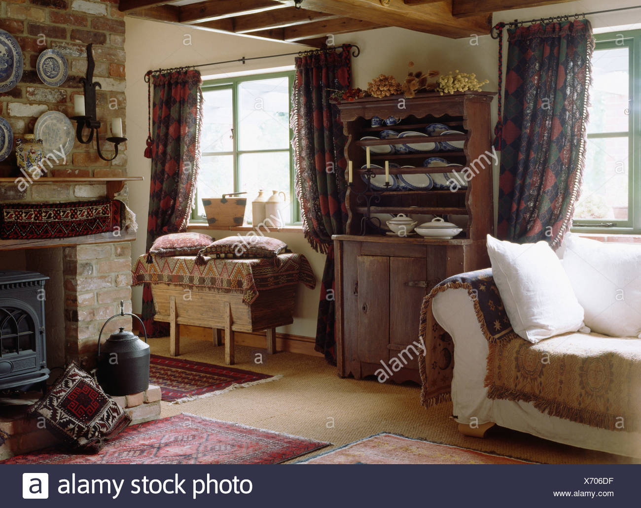 Antique Pine Dresser Beside Cream Sofa In Cottage Living Room