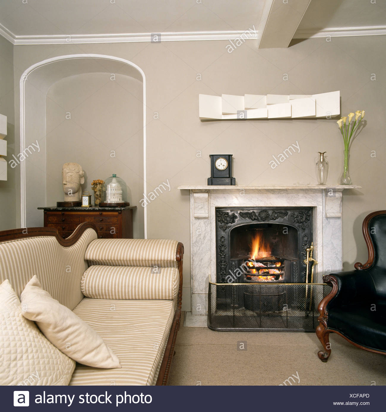 Cream Antique Sofa Beside Fireplace With Marble Mantelpiece And