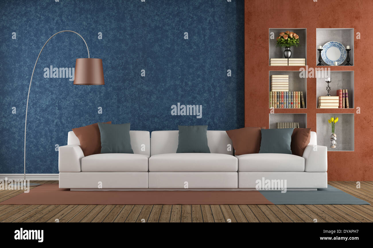 White Sofa In A Blue And Orange Living Room Rendering Stock