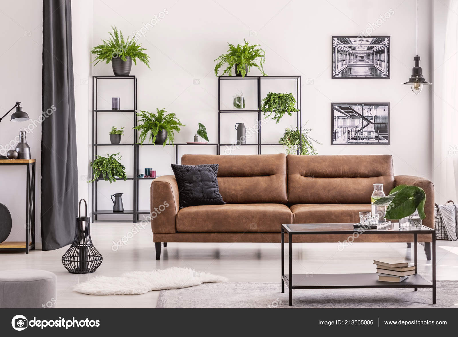 Table Front Brown Leather Couch White Apartment Interior Posters