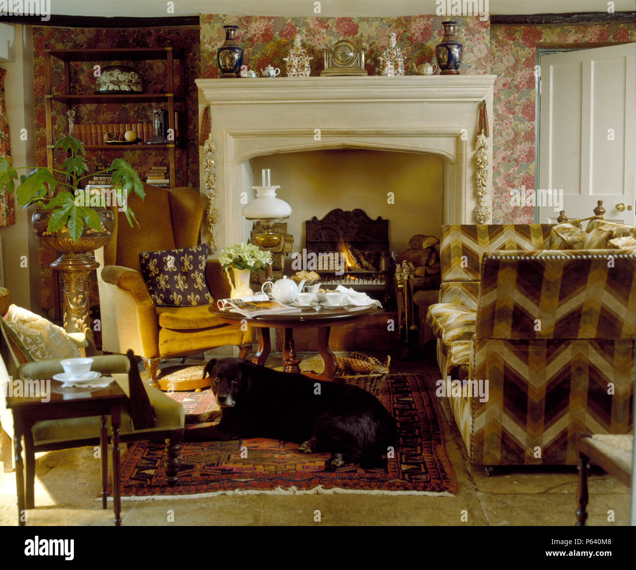 Labrador Dog Lying Beside Small Table Set For Tea In Front Of The