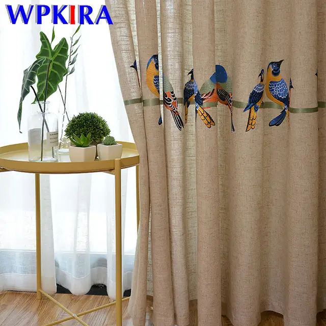 Beige Linen Blackout Curtains Chinese Bird Embroidered Tulle For