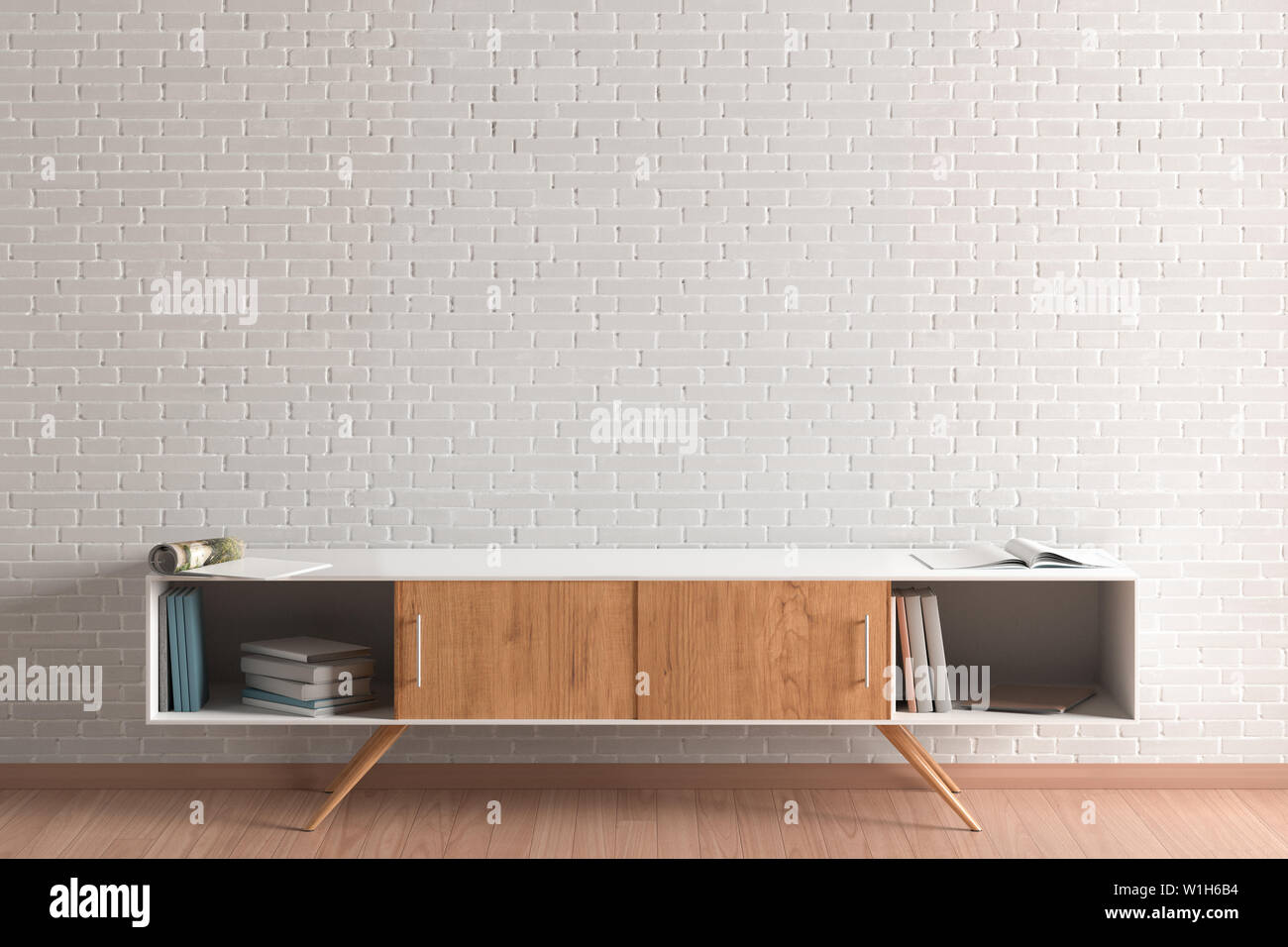 Cabinet In Living Room Interior And Blank White Brick Wall 3d