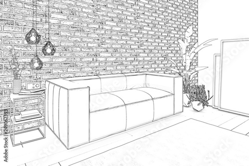 3d Illustration Sketch Of Cozy Living Room With Sofa And Brick