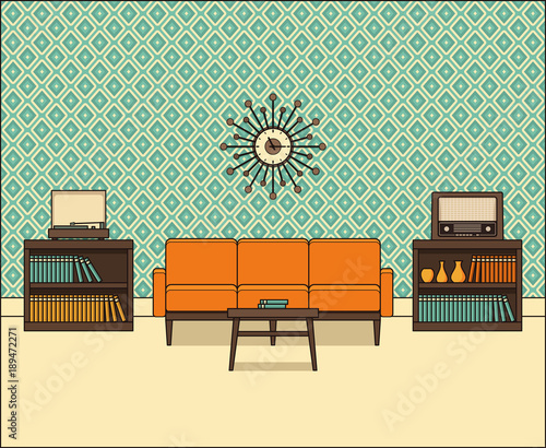 Living Room In Flat Design Retro Room Interior 60s In Line Art