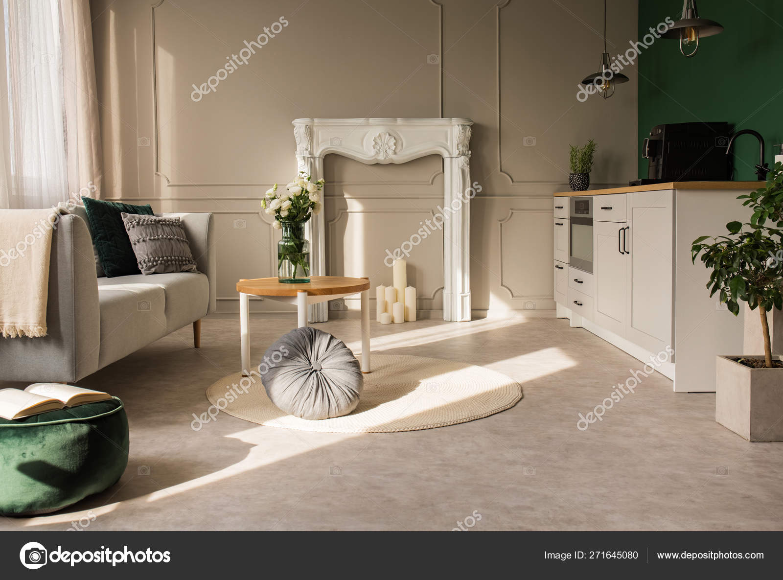 Open Plan Kitchen And Living Room Interior With Grey Cabinets