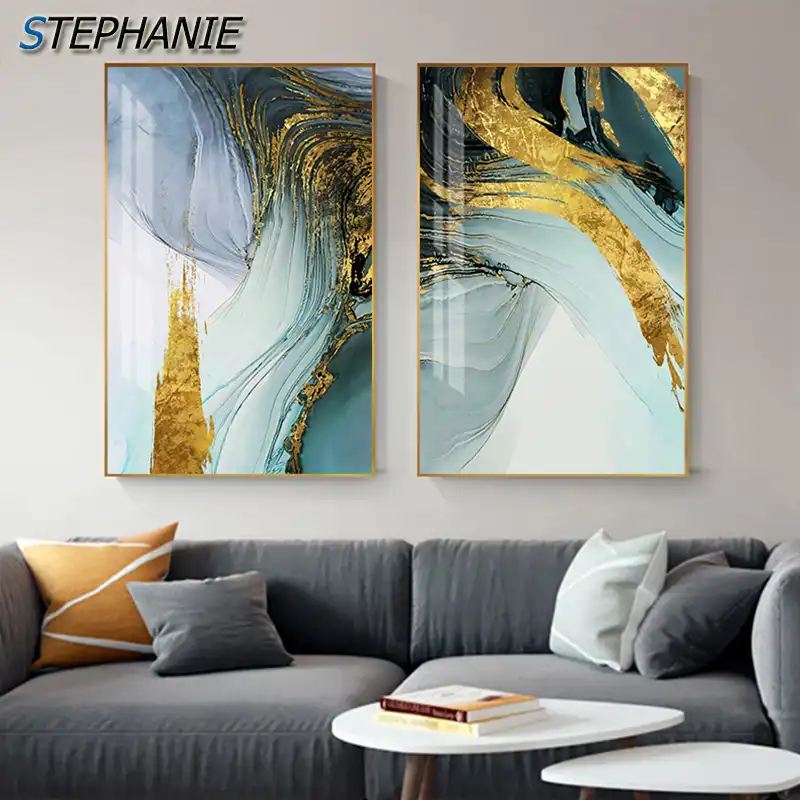 Modern Abstract Green Gold Foil Canvas Art Fashion Blue Poster And
