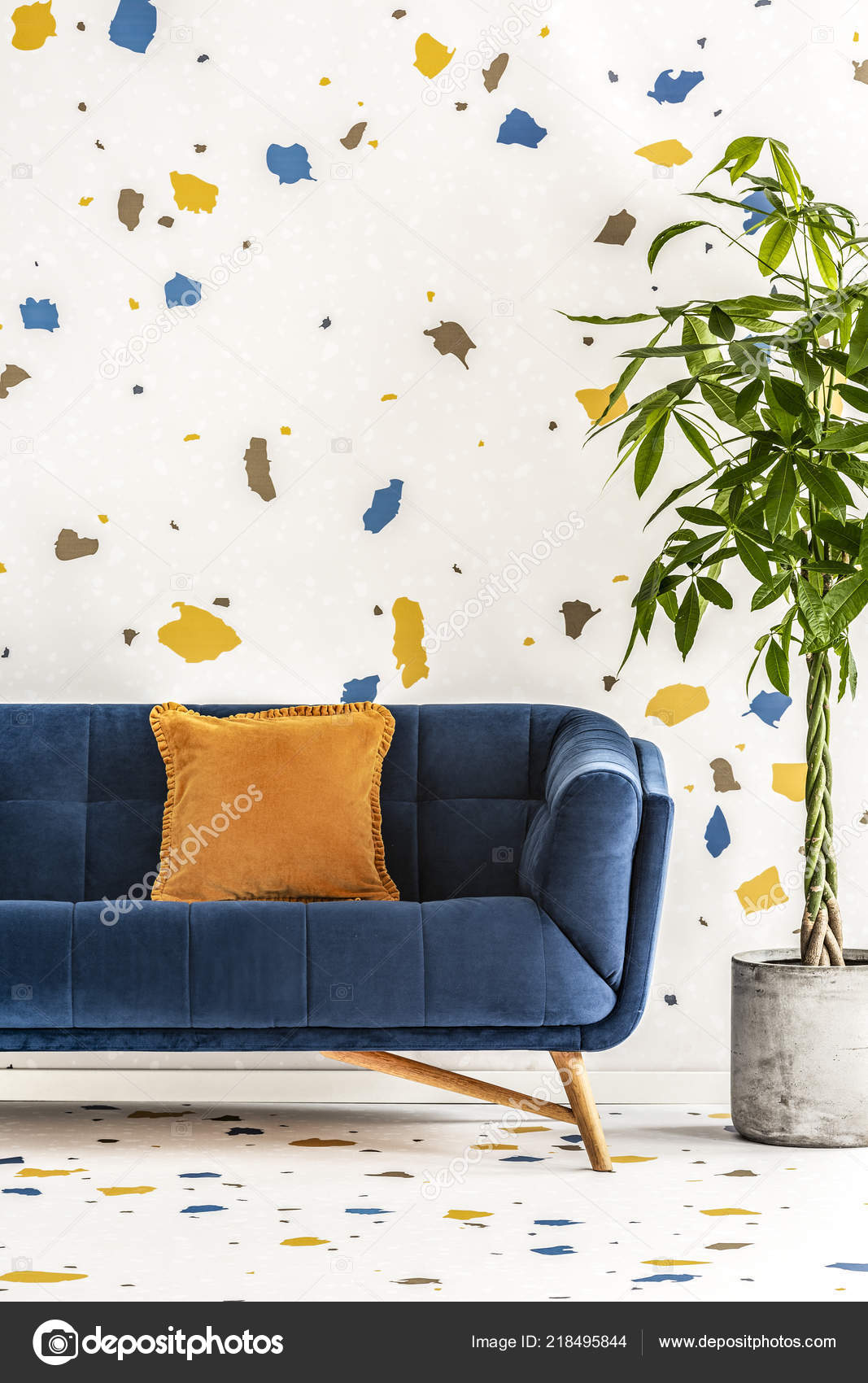 Plant Next To Blue Couch With Orange Cushions In Living Room