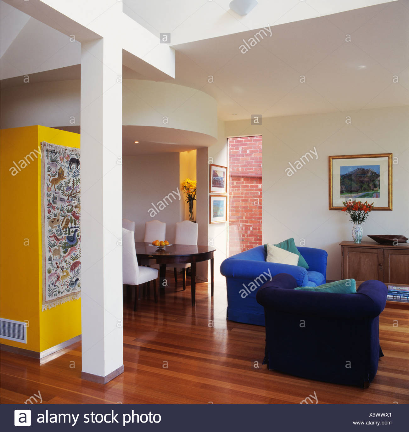 Bright Blue Sofa And Armchair In Modern White Openplan Living And