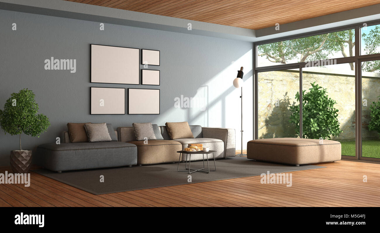 Minimalist Living Room With Brown And Blue Sofa 3d Rendering