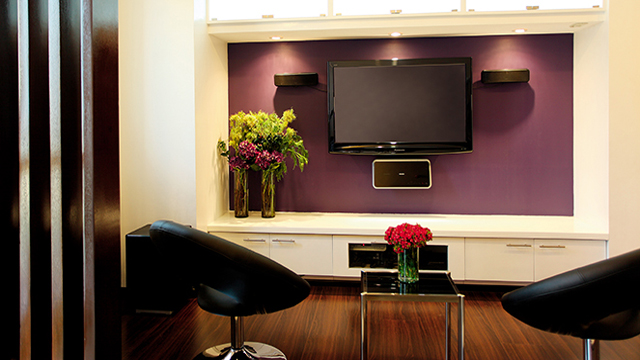 To balance your color design use pale hues of reddish dark brown for your wall surfaces and floor. A traditional design focuses on deep colors that will work in harmony with a burgundy leather sofa and chairs. The muted peachy yellow is a fail proof alternative to basic beige.